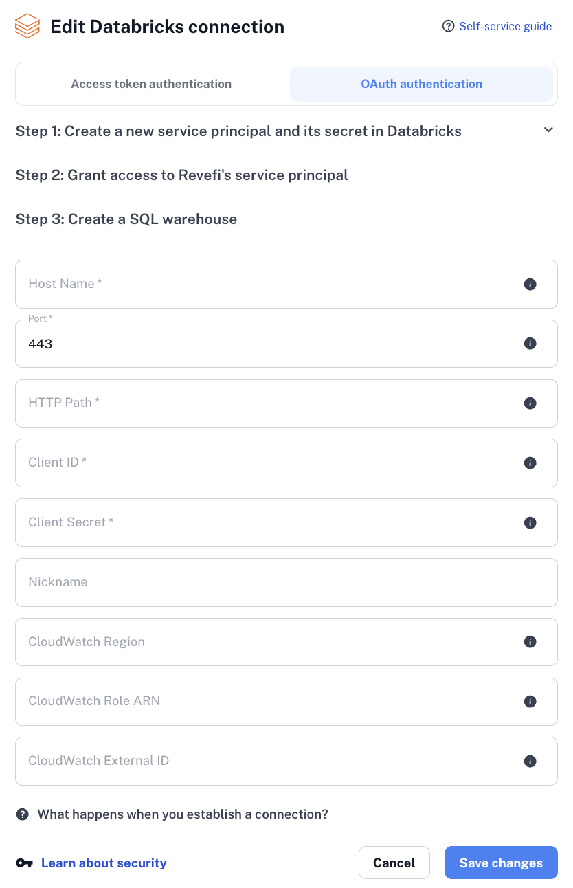 Finally now you can onboard your Databricks account on Revefi. On the connections page, click the 'Add connection' and select Databricks as the source. Then select Oauth Authentication at the top. The HostName, Port and HTTP Path fields come from the SQL Warehouse created in Step 3. The ClientID and secret comes from Step 1.
