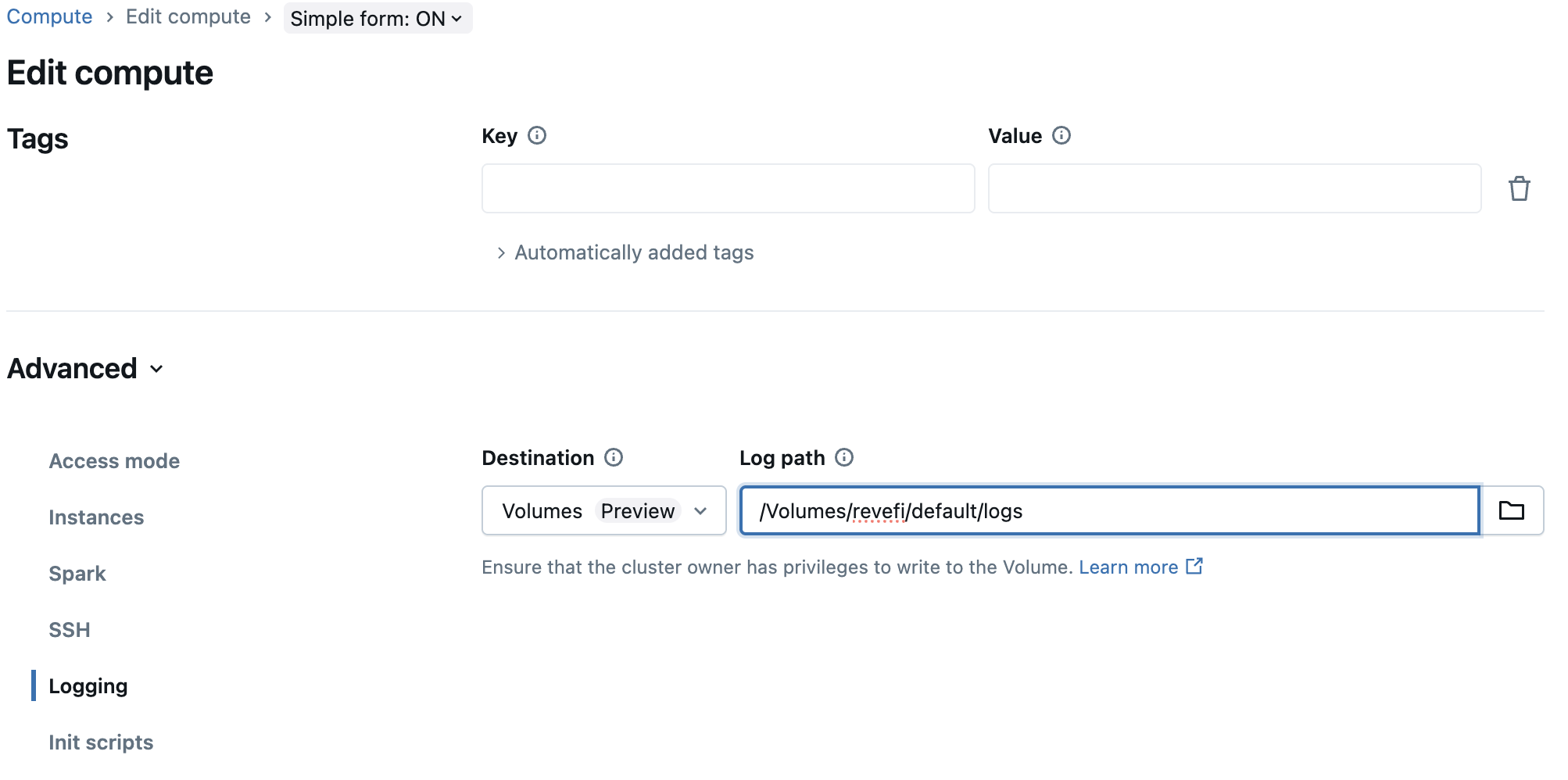 Then change the logging setting on clusters to write logs to /Volumes/revefi/default/logs path and save. Any changes in the settings will restart the cluster immediately, so it is best if this change is done when the cluster is in terminated state.