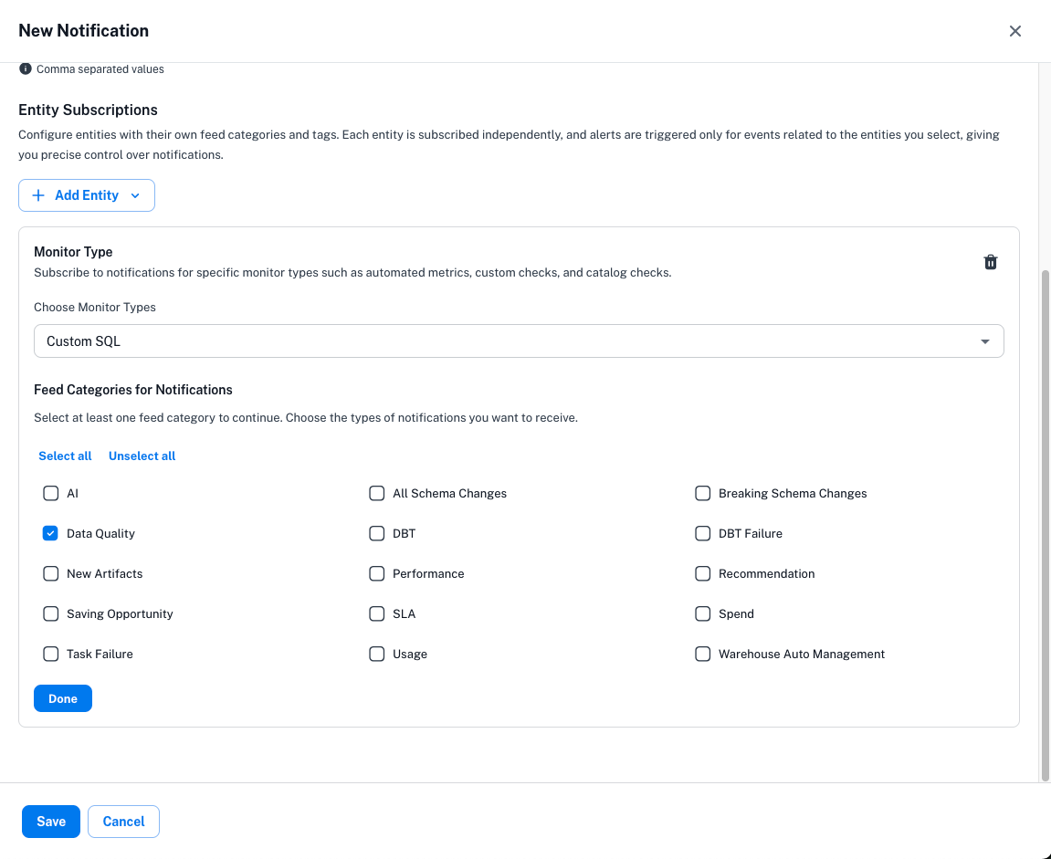 Select the Monitor Types you are interested and select "Data Quality" in the feed categories section.