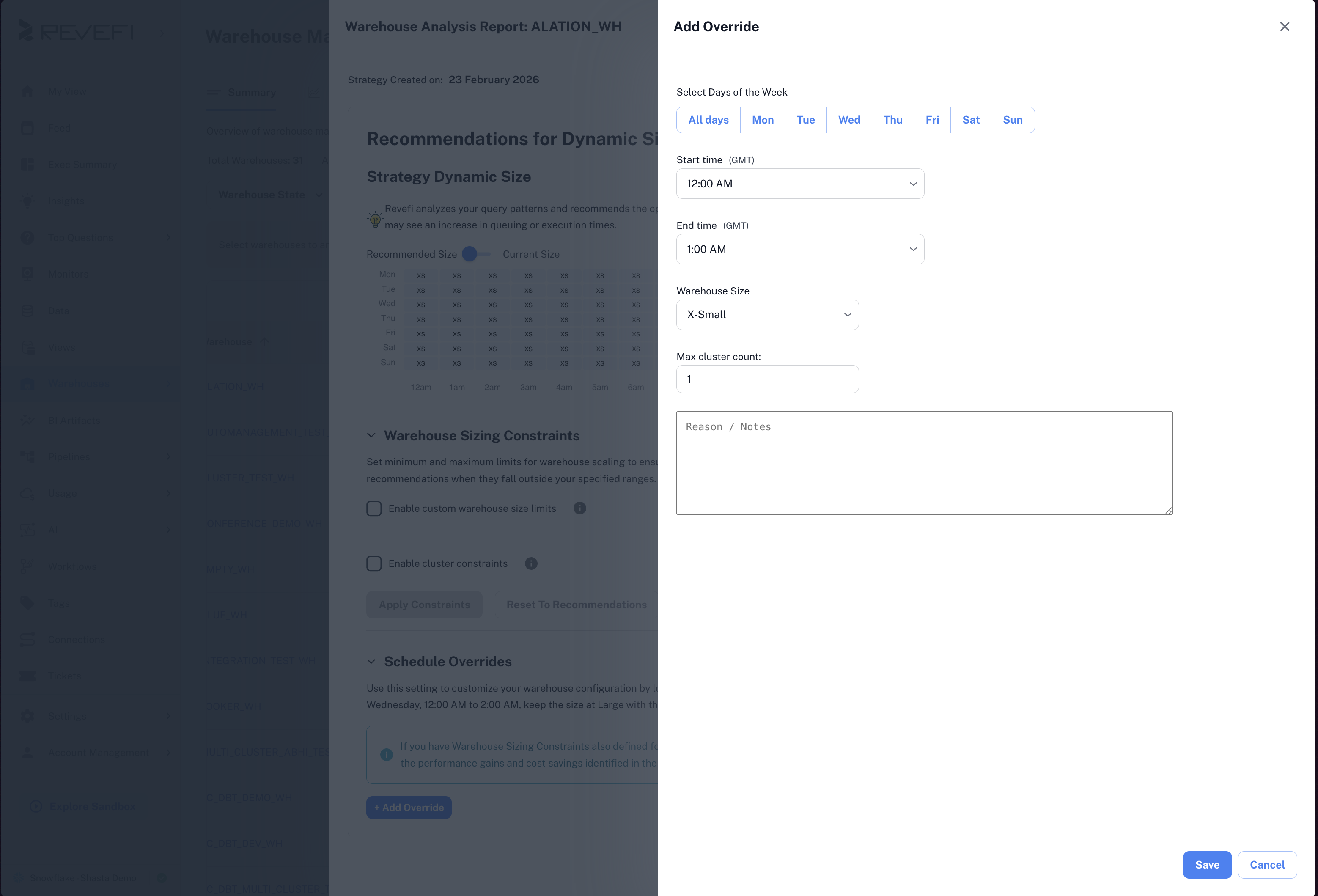 When Revefi auto-manages a warehouse, it generates a schedule based on usage patterns. Use Schedule Overrides to lock in a specific warehouse size for recurring time windows. During an override window, Revefi applies the exact configuration you specify instead of following its auto-generated schedule. Outside those windows, Revefi resumes normal auto-management.